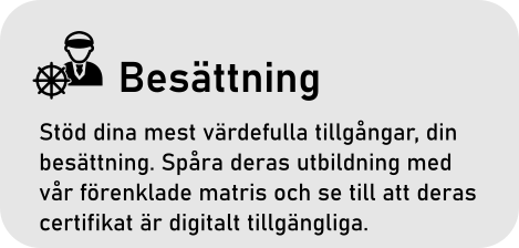 Att ha ett interaktivt papperslöst säkerhetsledningssystem tillgängligt både online och offline effektiviserar kommunikationen, synligheten och spårbarheten av era mest värdefulla tillgångar, er besättning och era fartyg. Våra funktioner har utformats för att ta hand om 100 % av er verksamhet, vilket innebär en komplett lösning för er sjöfart.